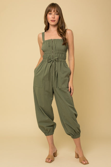 GILLI Olive Ruched Elastic Front Zipper Jumpsuit